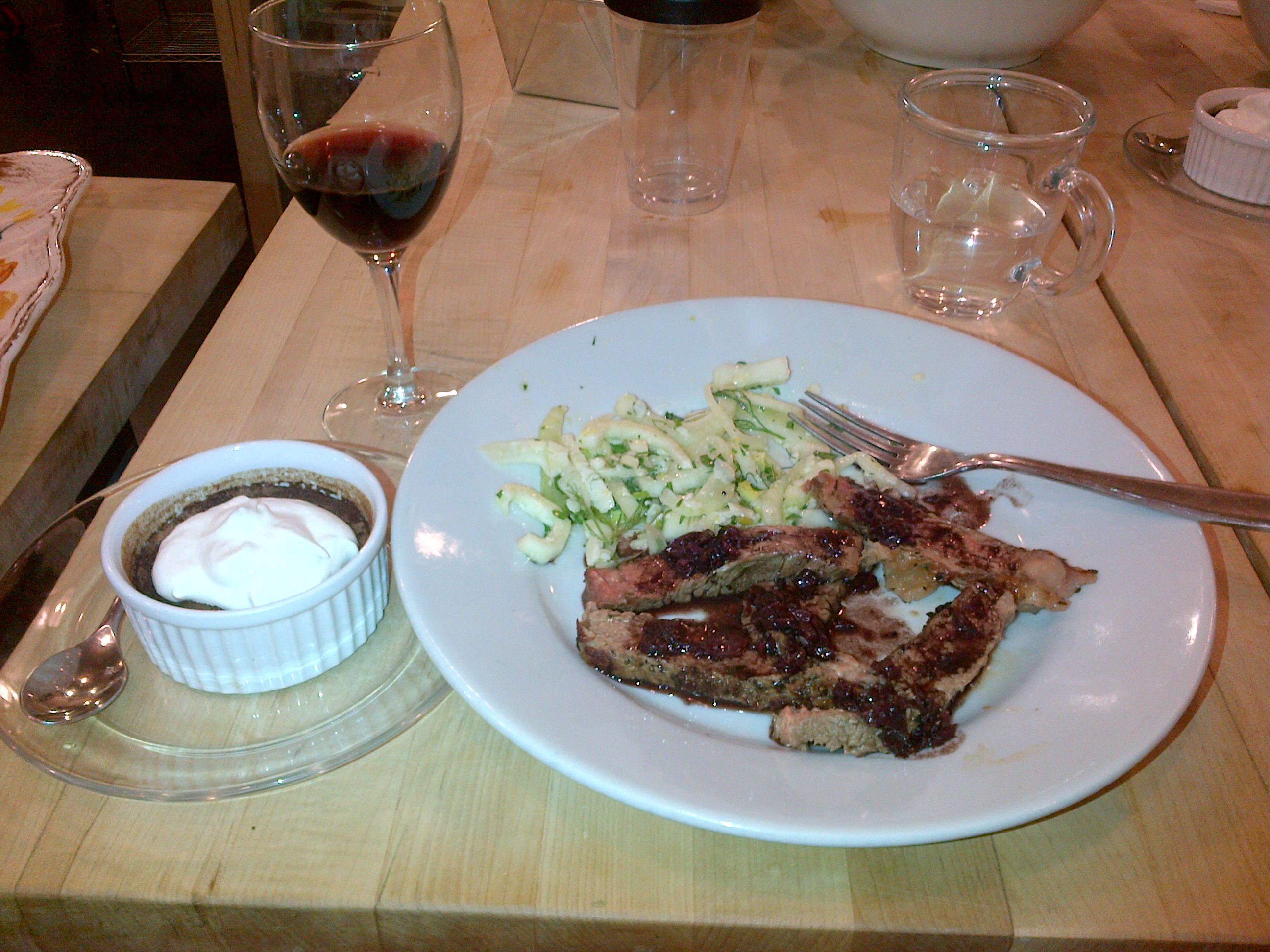 Onto the main course: a seared New York Strip Steak with Chianti-Red Wine Sauce. Rubbing down the steak with oil I yelled out “too bad I’m a vegetarian”, everyone in the class including the instructors stopped and dropped their jaws. “Just kidding – carnivore here!”. And happily went about seasoning the steak with some salt/pepper. I’ve never cooked steak on a frying pan so it was an interesting method. I missed some of this part of this while Amy and I took beauty shots with our salad – we’re hams (as you will see here)! Then I came back over to the stove just in time for the Chianti sauce which contained some chives, spices, oils and of course Chianti wine. I knew I would love this dish – it’s similar to what I order when we go out to eat at a steak house. The cooking school was a BYOB, but we “didn’t get that memo”, so we were at first disappointed. Then we were overly excited when one of the couples shared their bottle of Bogle Pinot Noir, which paired perfectly with the steak!