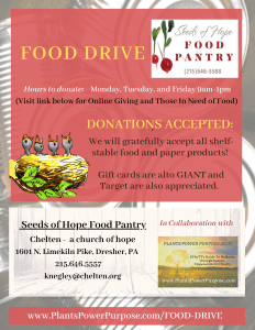 Check: Please make payable to “Chelten, a church of hope’ and note “Food Pantry” on the memo line. Mail to: Food Pantry Chelten, 1601 N. Limekiln Pike, Dresher PA 19025