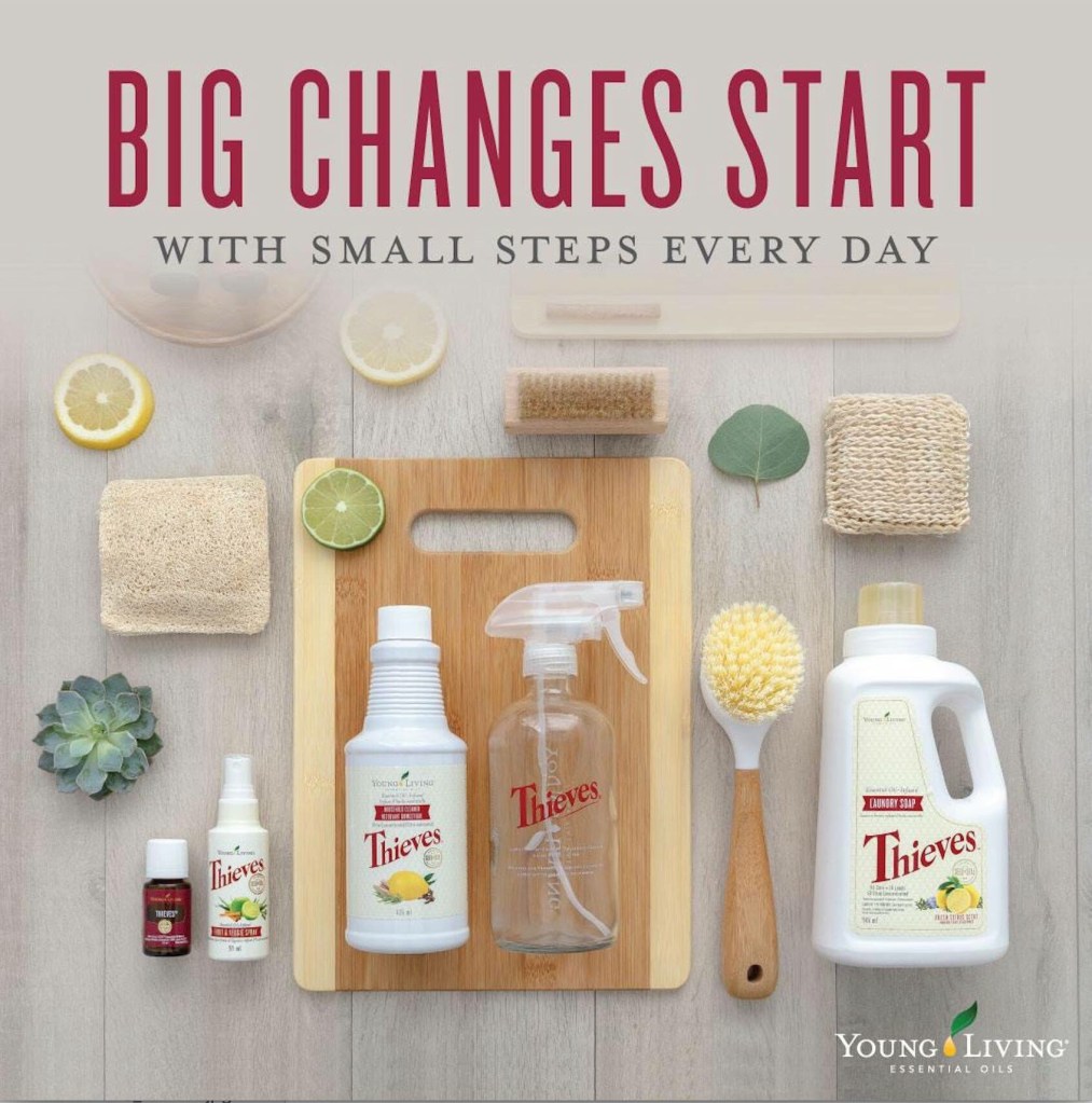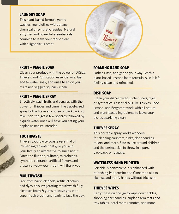Now, crafted in the spirit of that legendary combination, Young Living’s one-of-a-kind Thieves® blend can be found in all of Young Living’s Thieves products. Featuring the powerful essential oils Lemon, Clove, Cinnamon Bark, Eucalyptus Radiata, and Rosemary, Thieves imparts a spicy, welcoming aroma everywhere it’s used (and that’s a lot of places — checkout the list because it can clean EVERY part of the home!).
